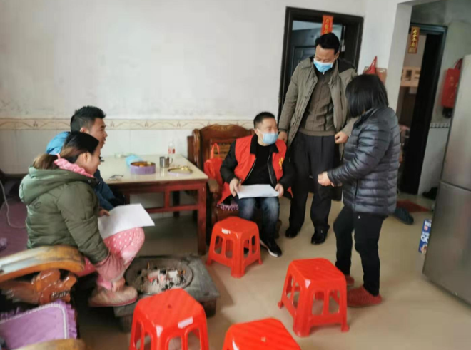 鎮(zhèn)領(lǐng)導與衛(wèi)生院醫(yī)護人員上門為群眾測量體溫,詢問身體情況。