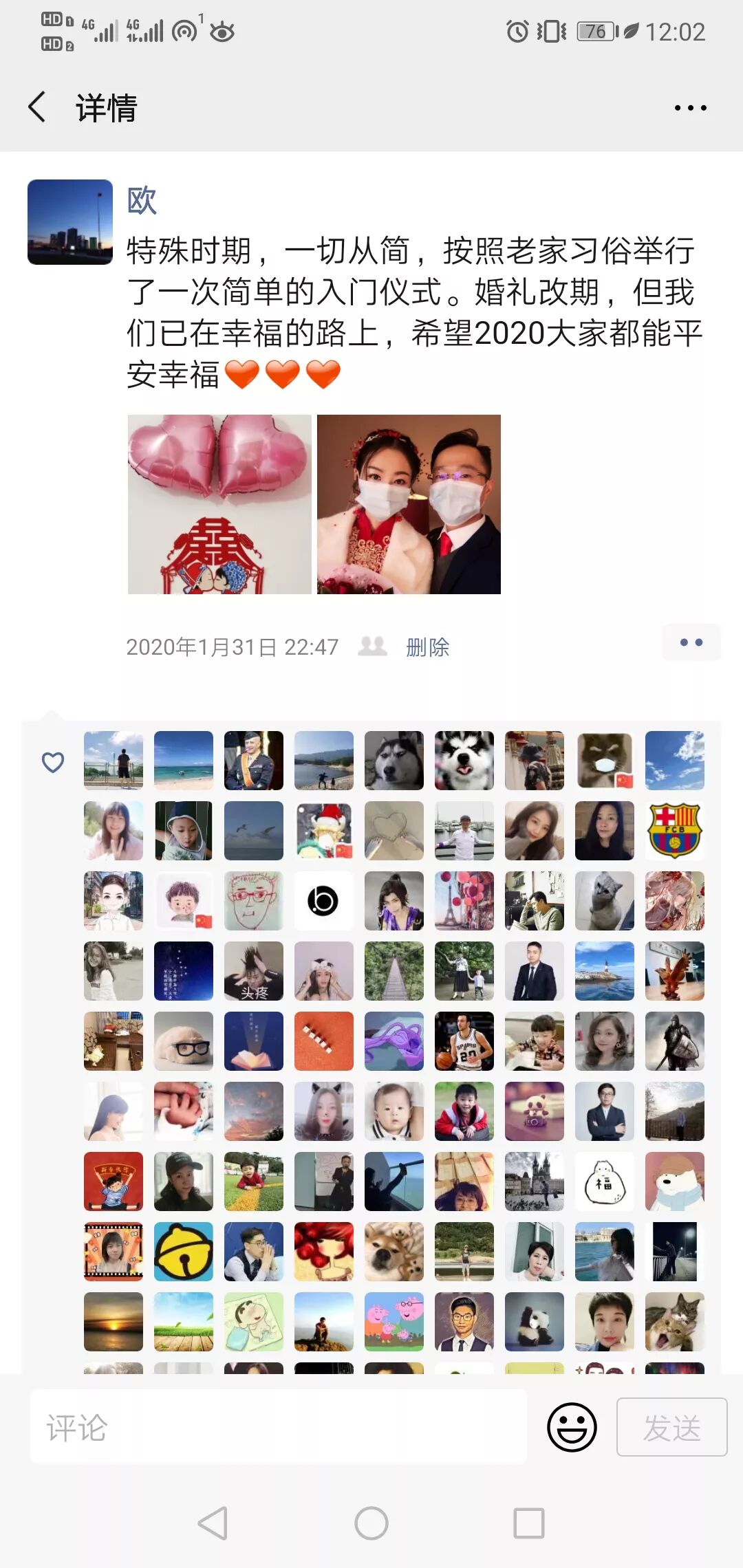 歐泉強(qiáng)的親朋好友紛紛點(diǎn)贊這場朋友圈“兩個(gè)人的婚禮”,并留言祝福?!叭∠麛[酒都是小事,做好防疫工作才是大事。作為黨員,聽黨號(hào)召是第一條,今年春節(jié)不聚,對(duì)他人好,對(duì)家人好,更是對(duì)自己的愛人好?!睔W泉強(qiáng)說。