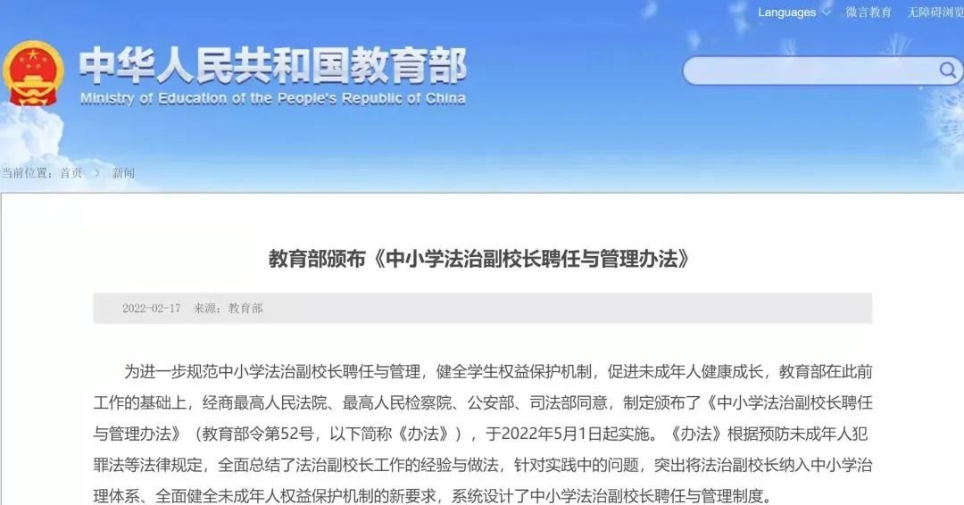據(jù)教育部2月17日召開的新聞發(fā)布會消息,為了進(jìn)一步健全法治副校長制度,教育部經(jīng)商最高人民法院、最高人民檢察院、公安部、司法部,在中央政法委的指導(dǎo)和相關(guān)部門的支持下,制定出臺《辦法》,自5月1日起施行。